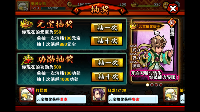 如果商城的武将对你来说相对太贵了,没关系,还有低消费的抽奖供你选择。不过抽奖就不能保证你获得想要的武将哦。