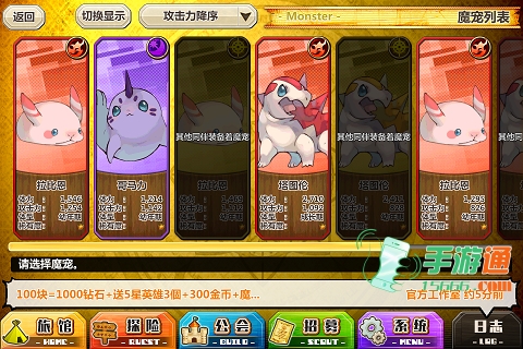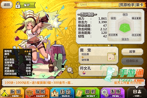 【游戏画面】★★★★(8分:整体视觉效果良好,有部分亮点) 《梅露可物语》传承了日系RPG的画面风格,画风清新淡雅,在渲染上没有使用过重的色调,插画般的场景,细腻的人物刻画和带有治愈感的清新色彩,降低了玩家的视觉疲劳,但游戏界面布局较为凌乱,插入了各种官方活动公告。 【游戏模式】★★★★(8分:值得去深入研究) 在战斗模式上,《梅露可物语》融合了卡牌养成与横向战斗元素,以剧情为线索展开战斗。战斗以5人小队为基础,根据近程,远程,辅助回复等不同的职业特性进行搭配。而每个同伴都可以装备一只魔宠。使得游戏非常具有策略性. |