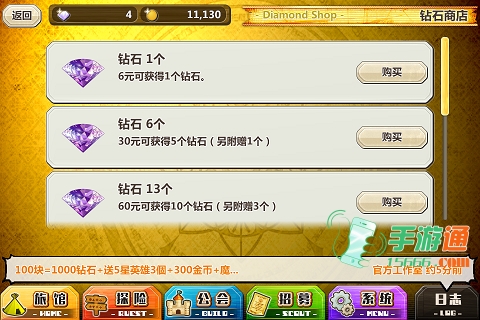 游戏中6元等于1钻石,价格是相对比较昂贵的,而除了使用金钱购买,也可以通关主线关卡,达到一定的完成率后也能获得钻石,但是获取难度都相对较高。
