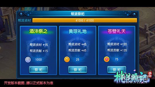 3.帮派祭祀:每天可祭祀一次,有三种祭祀类型可选,第一种酒沣祭之需要1000银子,第二种黄琮礼地需要25金子,以及苍壁礼天需要75桃心,祭祀后会获得相应的帮贡。