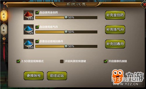 设置系统 天龙八部手游的设置系统也是相当的出色,设置系统里面分为战斗设置和系统设置。战斗设置中,可以选择2.5D的固定视角模式,可以开启风景拍的快捷键,可以开启摄像机跟随,可以设置自动使用药品。 系统设置里面可以进行游戏音乐和音效的开关,可以开启防干扰的模式,更可以对游戏画面进行自主的设置,非常的人性化。