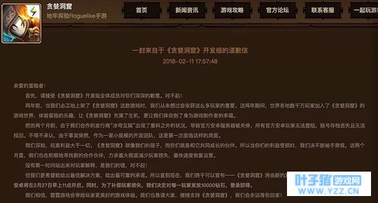 去年年底,钱宝网老板自首一事引起了业界的广泛关注,钱宝网旗下游戏公司冰穹互娱也受到牵连被查封。而《贪婪洞窟》是冰穹互娱之前运营的最成功的产品之一。 由于查封一事,《贪婪洞窟》官方安卓服务器被全面关停,导致安卓玩家无法登陆,玩家账号、存档全部丢失且无法找回,游戏官方也未能在第一时间做出解释,导致游戏评分猛降。 随后,游戏开发组与雷霆游戏达成合作意向,已经开始着手将游戏包体转移至雷霆游戏服务器,并对安卓端玩家做出补偿措施。 《贪婪洞窟》官方表示,将后续计划中将“以稳定的服务器作为保障,同时会进行外挂打击和游戏环境净化,重建一个干净健康的游戏氛围”。