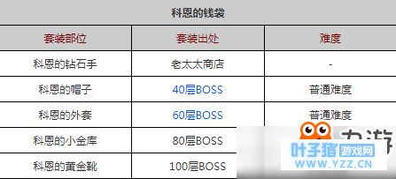 科恩套装怎么得 科恩套是游戏中最先可以获得的套装,这套装备最大的作用就是可以大幅提升幸运值,无论是套装中单件属性还是套装效果都是加幸运的。 【套装效果】 两件效果是+45幸运; 四件效果是攻击可能偷取黄金; 五件效果为拾取钱袋的黄金翻倍。 【套装出处】 下面是小编整理的科恩套装的掉落地点: