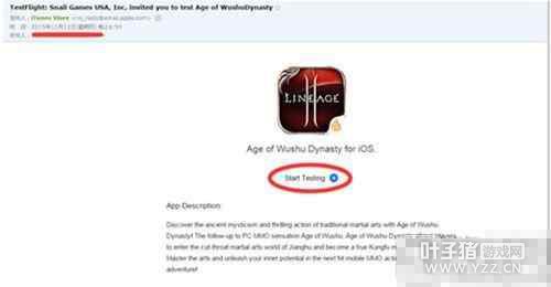 使用手机在邮箱中查看发件人为“iTunes Store”的通知邮件,邮件标题以“TestFlight”开头,点开邮件后点击“Start Testing”跳转至天堂2血盟手游客户端下载界面。 重要注意事项:请先确认设备系统版本在IOS8.0以上,否则将无法跳转至下载界面。 【第5步】:下载并安装客户端