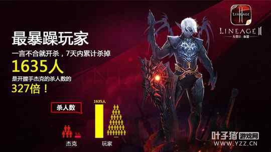 《天堂2血盟手游》中对于红名的惩罚还是非常有力度的,但是这也档不住暴躁玩家的杀人欲望。据统计,本次测试中杀人最多的玩家累计杀死了1635人,一言不合就开杀,历史上赫赫有名的开膛手杰克简直无法和他相提并论(这个比喻还真是有点……吓人呢)。 当然啦,最后只要大家玩的开心就是最好的,想要知道更多关于《天堂2血盟》手游的最新消息,就来关注叶子猪吧! [编辑:叶子猪小秘书]
