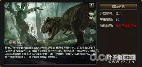 原始之岛位于鲁因城镇的南方,该岛上生存着很多不明生物。这些生物不仅体型巨大还残暴成性,对待踏上岛上的任何生灵都会追逐并加以毁灭。但是,这座岛也隐藏了很多动人心魄的宝藏。每一个得到原始之岛宝藏图的人,都会在诱惑的驱使下,踏上前往原始之岛的路。 玩家等级达到50级可以通过活动界面进入原始之岛(大地图上不显示),地图是全天开放的,在岛上杀戮不增加相性,岛上的怪物也是很凶残的,建议玩家以组队的形式参与。