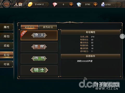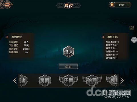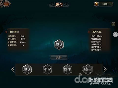 目前的爵位包括狼人、平民、侍卫、骑士、贤者、男爵、子爵、伯爵和侯爵。每个绝对对于玩家的声望和等级都提出了要求,比如平民需要获得20000声望,等级也要达到20级。此外,不同的爵位对于给玩家带来的属性加成一不一样,爵位越高,属性加成就越多。