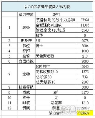 A 是装备标明的战斗力 B 是属性与战斗力的加成系数 C 是装备武器中附带的基础参数 D 是基础参数换算成的战力值 E 是个别装备强化+8后得到的额外战力值 F 是个别装备强化+11后得到的额外战力值 G 是个别装备强化+15后得到的额外战力值 H 是附魂每层提升给的战力值 I 是个别装备附魂+10后得到的额外战力值 J 是个别装备附魂+12后得到的额外战力值 K 是个别装备附魂+15后得到的额外战力值 今假设你穿C40武者普品装备武器,全套强化+8,附魂全套+10,所有装备0精炼,身带1级血盟奉献披风,3阶护身符,骑士爵位,符印战力假设为1000,拥有系统送的最基础坐骑,血盟技能战力加成假设为2000,带首充送的宠物10阶坤坤(战力5646,宠物收集数10,总阶数80,总天赋数18),技能等级提供的战力假设为5000,无称号,穿恶魔时装,成就3阶,坠星贵族,那么你的战力总和大约9万,下表说明
