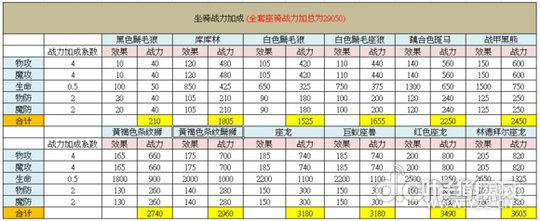 上表中蓝色框代表该坐骑能提供给你的战力,在表最上方红字的部份,则是当你收集表中所有坐骑后能提升的战力总和,有接近3万的战斗力啊!!!然而!!这些战斗力中,其实有部份都是虚战力!!!物魔双攻是两个替代性属性,就像物攻对法师而言就是鸡叻,但是却算进综合战力之中,当然!!不止坐骑有这种情况!!宠物/称号/爵位/成就/护身符/贵族等这些能提供战力的途径都会有这种虚战力的情况,所以也就见怪不怪撸~