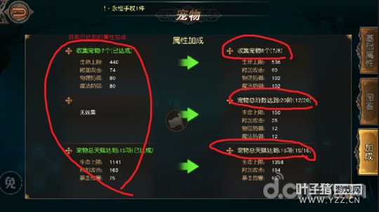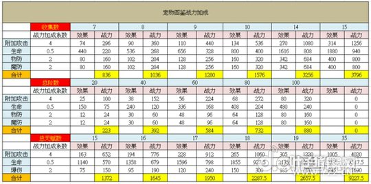 上图中坐骑右方就有提供坐骑属性等相关数值,其中下方的坐骑总属性就是你拥有多少的坐骑后,其各自坐骑属性叠加后的数值就是下方总属性的数值!!!另外坐骑可以提升星数跟进阶的,每提升一星或是进阶都能有些微的战力加成,大家可得好好养他搂!!其中宠物相关升星与进阶的材料都是在空间之塔打的!!! 三、宠物:宠物不像坐骑一样,可以叠加属性,但是宠物有另外的战力加成模式,靠着收集,升阶总数与天赋总数的达成有相应的加成奖励,一样我整理成表给大家了解了解!!上图如下: