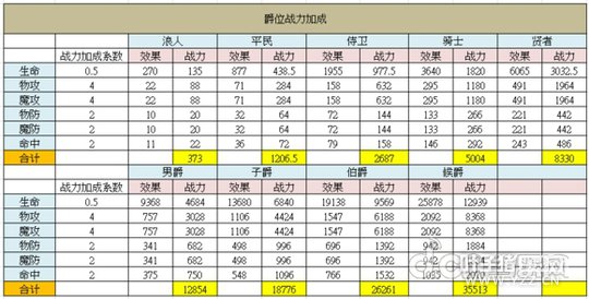 另外宠物选择好常用的那只进行升阶跟练级就好了,因为不管你有多少宠物,只有出战的那只才能带给你属性与战力加成!!所以选择好的宠物常年陪伴在你身边就很重要了!!另外这里有些小技巧提供给新手玩家了,那就是宠物总阶数的加成部份可以用多个宠物升阶来完成条件,因为阶数越高宠物吃的进阶石数量就越多,所以可以用其他没在使用的宠物使其进阶来达成宠物总阶数的属性加成条件会比较节省进阶石的用量,基本上建议以不超过5阶为准!!!另外还有一个要提出来说的是,很多新手玩家对于宠物的选择有战力上的误区!!比如说4阶宠的帝波相比同为4阶的耶鲁或是布鲁来说其战力会高出许多!!那是因为帝波属于双攻双防一体宠,其自带的基础属性中因为拥有双攻,加上双攻本身对战力加成的系数又比较大,所以战力自然就会比较高撸,然而,双攻中你也只能用到一种,另外一种就成为你的虚战力了,另外该类宠物其天赋属性为防御属性,而耶鲁跟布鲁都是主攻击的宠物,其拥有的基础属性有物理与魔法的区别(耶鲁为物理攻击宠物,布鲁为魔法攻击宠物),天赋属性以攻击为主,所以选择宠物的时后可别乱选了,基本上骑士跟奶妈主要建议以双攻双防带防御属性的为主,该类宠物有火凰/幼龙/巴拉卡斯/帝波/改良型小狮子/小狮子,斗士刺客黑弓等物理攻击的职业,以5星宠物来选的话就建议用日光,4星建议用耶鲁,法攻型职业5星建议用月光,4星建议用布鲁,3星以下不考虑。 四、技能:提升技能等级也能增加战力的,主动技能必加战力,被动技能如果跟属性提升有关的也会加战力,但是像被动技能里面辅助技能类的都不加战力的,其他的就不多说了。 五、称号:这边的称号是指官方活动透过充值或是游戏内特殊管道获取的称号,比如情人节官方出的情人节活动,充值100可以拿到完美情人的称号,大约加了2000多的战力,这些称号赋予的属性都是永久叠加的,所以如果能力许可的话,能入手就入手吧,其效用跟坐骑属性叠加差不多。 六、爵位:爵位的部份是透过声望点数来换取的,其每个阶段战力提升的部份我一样制表让大家参考。