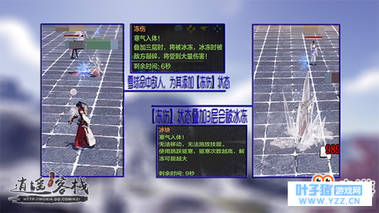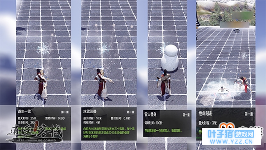1、道生一雪:向前方丢出一个雪球,对非冰冻的敌方造成10%生命值的伤害。消耗一个雪球。调息时间:2秒。 2、冰雪三叠:向前方10米扇形范围内丢出三个雪球,每个雪球对非冰冻的敌方造成10%生命值的伤害。消耗5个雪球。调息时间:4秒。 3、雪人替身:在面前堆砌一个临时雪人,抵御雪球。调息时间:100秒。 4、绝命敲击:击碎前方3米内被冰冻的敌方玩家(对处于冰冻的敌人使用将拥有一击必杀效果) 此外还有两个锁定状态的技能,需要拾取对应的特殊雪堆后方可施展: 1、冰冻指诀:冻结周围10米范围内的所有非冰冻的敌方玩家,并造成20%的生命值的伤害。消耗一个特殊雪球。 2、离冰之渊:向前方丢出一个雪球,雪球落地后产生一片冰面。行走在冰面上的人将被减速(无论敌我)。消耗一个特殊雪球。 嬉雪之赛全纪实 玩家进入活动位面后即可获得30个普通雪球,数量以BUFF层数的形式显示在气血条上方,普通雪球的携带上限也是30个,此外还有一个内息回复翻倍的增益状态,除了打雪仗的特殊技能以及自断经脉外,其他门派、身份技能均无法使用,位移方面可使用翻滚、疾跑、一段跳,但无法使用轻功。