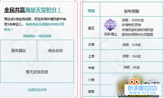 03全民共赢海量天赏积分! 每达成1档全民成就,即在所有祈福玩家中抽取5名幸运儿, 每名幸运儿奖励52800天赏积分!