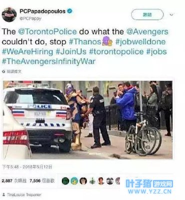 近日,一张"灭霸多伦多遭到警方逮补"的照片在网上走红。其实这并不是真正的逮捕行为,而是当时民众在多伦多即兴拍出来的照片。