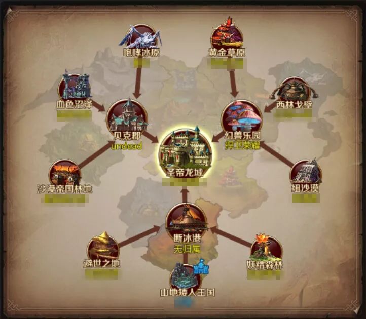 公会领地(13个) 分三级 : 外城( 9 个)、内城( 3 个)、主城( 1 个) 分别和世界地图一一对应