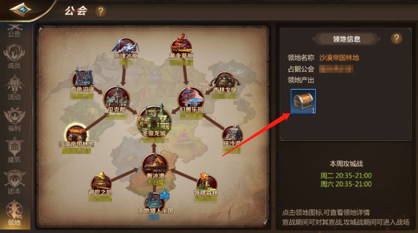 占据领地后 公会成员可以 在 “公会” - “领地” 界面 领取 领地产出奖励