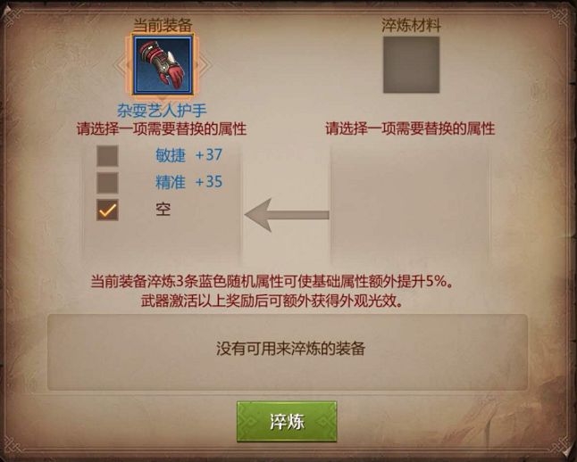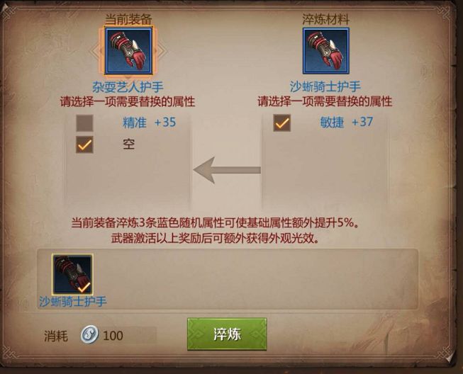 装备淬炼是将装备随机属性移植到目标装备, 为装备增加新属性 ~ 相同属性 或者 超过上限的属性 , 会被替换 !