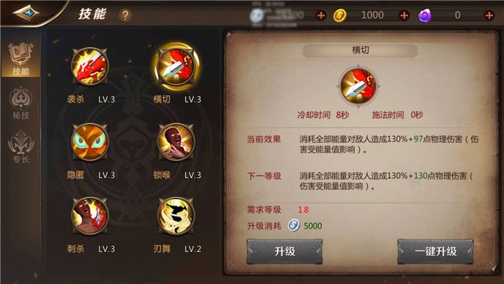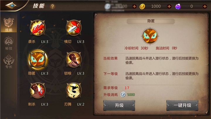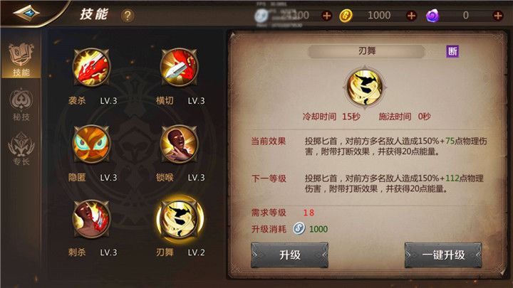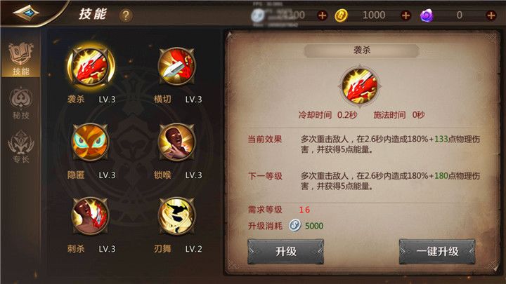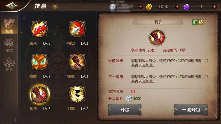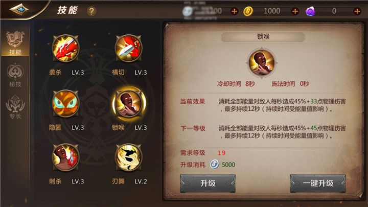 【特点】持续伤害 锁喉,刺客持续伤害技能,使用此技能对敌方造成持续伤害,CD时间 8s 。消耗全部能量对敌人每秒造成 45%+33点 物理伤害(随着技能等级的提高,物理伤害则会增加),最多持续 12s 。切记,此技能持续伤害的时间会受能量值的影响,所以尽量在 高能量值 时使用!