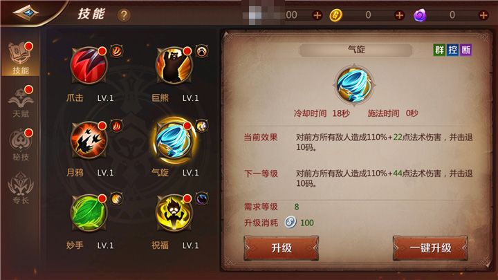 【特点】击退,打断 气旋可以说是 保护奶 和 输出 的最好的技能了,打副本时看见小怪贴近,一个气旋就直接吹到九霄云外。打PVP,看见对面战士冲过来直接 一个技能吹走 ,想碰我家奶和输出?门都没有!无论是打PVP还是PVE都是守护者神技之一,但是 CD略长 ,慎重使用。