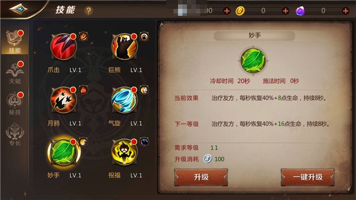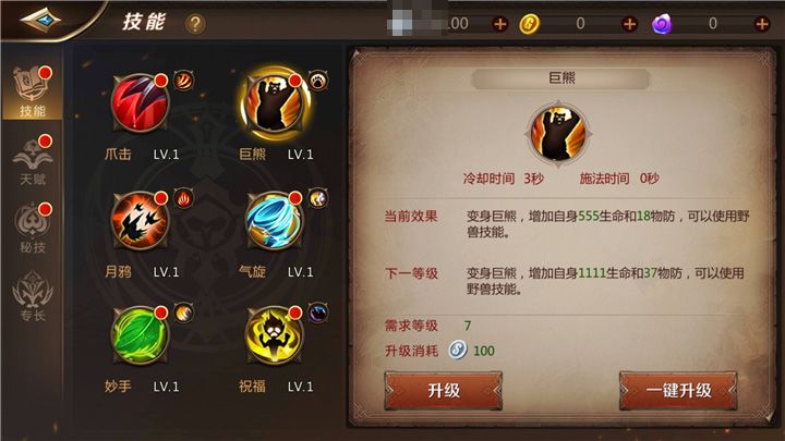 【特点】高血量,高防 小德的核心技能,变身熊形态后, 增加超高血量 以及 物防 ,这一点是其他坦克望尘莫及的。每加一点技能点,都会大幅度增加生命值和物防,可以说是必点技能!