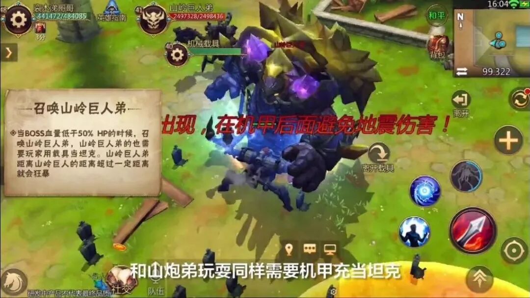 当boss的血量只剩 50% 时, 山岭巨人的弟弟—— 山炮巨人 就会被召唤出来!和山炮弟玩耍同样需要机甲充当坦克。当两个boss 距离过近 ,则会触发技能 地震 ,将会持续捶打地面 四次 ,范围内的玩家将会受到 大量伤害并减速 !躲避这个技能的诀窍就是 躲在机甲的后面 , 当遇到地震伤害时,会被机甲吸收~