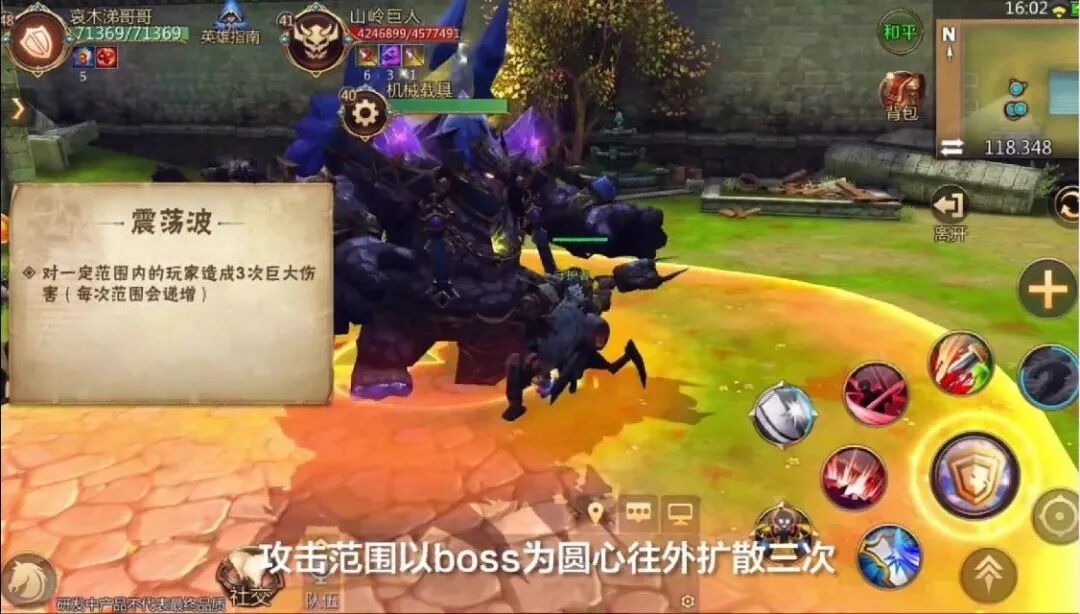 Boss还有一个范围技能—— 震荡波 ,攻击范围以boss为圆心往外 扩散3次 ,前两次的攻击为 极震区 , 伤害非常高 ,建议山上的群众可以 边打边退 ,最后一次范围最大,但伤害较小,应该 吃下 这波技能重新集合站位。