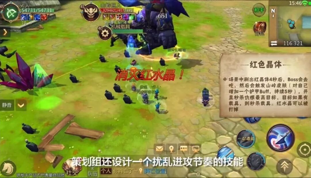 还有一个扰乱进攻节奏的技能—— 红水晶 。这一坨晶体会随机出现在场地中,boss吃到后即可释放出类似《七龙珠》中威力最强大的 元气弹 !噢,这简直是丧心病狂, 仇恨最高的目标将会被秒杀! 如果玩家骑上机甲,则 机甲被秒杀 ,玩家不受伤害。所以一旦红水晶出现,玩家应该 第一时间打掉 。提醒一下,场地 机甲有限 ,如果机甲损耗过大没有多余的机甲替补,也会造成玩家 团灭 哦~