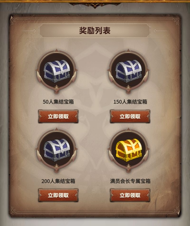 【活动奖励】 达到指定人数: 50 、 150 、 200人 即可获得集结 宝箱奖励 ~ 会长还可以获得 会长专属宝箱 哦~
