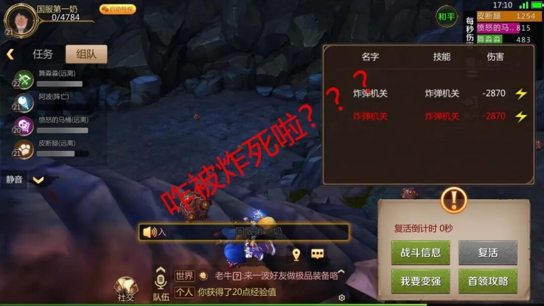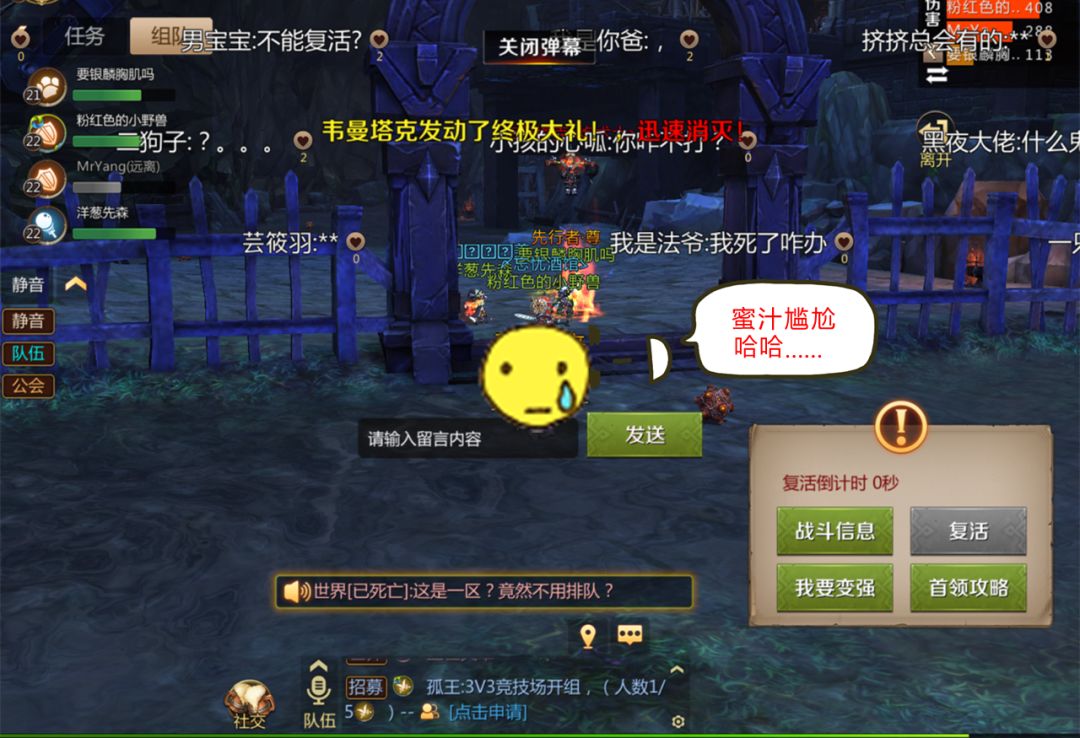 好死不死,全队人都回头打怪了, 结果几个炸弹在门口那里把我们全队人炸死了 , 屏幕飘着“我咋死了”、“我是法师死了咋整”....我打了哈哈两字。