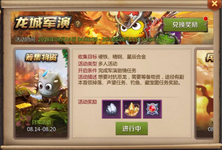 任务1:筹备物资 活动时间:8.14~8.20 血红祭祀派出了龙界赫赫有名的强者,想要对抗他们,圣帝龙城需要强力的战争工具相助。