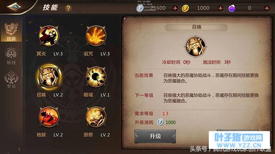 【召唤】 【特点】:召唤恶魔,融合 【解析】:与游侠的召唤宠物十分相似,但是不同的是,召唤恶魔后,技能更换为融合,能够跟宠物融合为恶魔,普攻变为AOE伤害,提高双防和伤害,但是期间不能释放技能。而且高达90s的CD,可以说是CD最长的技能了!但是凭借强大的伤害,还是可以打上4星的高分。