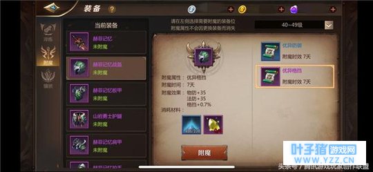 附魔的属性除了武器提供输出属性以外,其他位置的装备附魔均为防御属性。比如头盔的优异格挡附魔可以提供35点物防、35点法防、0.7%格挡。虽然时效仅仅为7天,但是可以在7天内让我们的实力得到显著加强,度过过渡期。