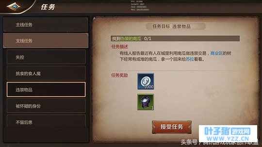 除了靠打怪,开宝箱这种有几率获得装备的途径,完成任务后的任务奖励则是100%获得装备的方法,十分适合脸黑的非洲人!并且有的任务奖励装备要比打怪给的装备更好哦! 例如图中的违禁物品任务,还有一个名为历史石碑任务,给的是紫色品质装备哦!