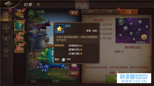 幻兽升星也可以提升幻兽的实力。幻兽都拥有自己的星图,通过使用星辉可以用点亮星光。点亮星光后幻兽的生命、攻击、物防和法防会有所提升。随着整张星图被点亮,幻兽的技能也会提升一级。(注意:幻兽技能只有在上阵并且作为队长时才会有效果)