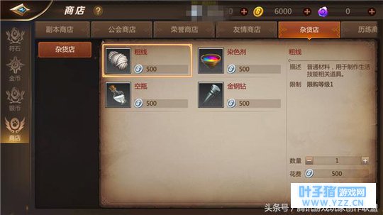 普通材料是游戏中最容易获得的生产材料了,我们只需要来到商城,在商城的杂货店中即可大量购买,普通材料有4种,对应4个生活技能,这4个材料价格均为500银币一个,没有购买数量限制。这4种材料是:粗线、空瓶、染色剂与金刚钻。