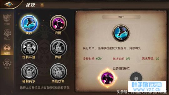 无论是在10V10战场中还是3V3竞技场中,最看重的还是伤害输出,想要打出更高的的输出,铭文和秘技起着关键的作用。 推荐秘籍:冷酷,次技能可以提高一击必杀的机会。在使用连招技能后敌人剩余血量20%~30%的时候使用这个秘籍可以起到收割人头的作用。疾行,可以配合一套技能打出输出,追击收割,还可以当作保命技能使用。