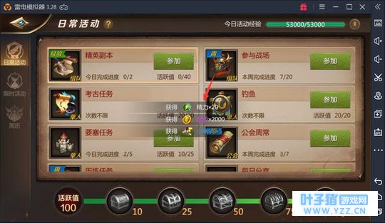 活跃奖励,也就是日常活动,下方的活跃奖励箱子里,有精力的奖励,一个箱子大概20精力这样,也就是说玩家每天完成了所有的活跃任务,也不会得到超过100精力的奖励。