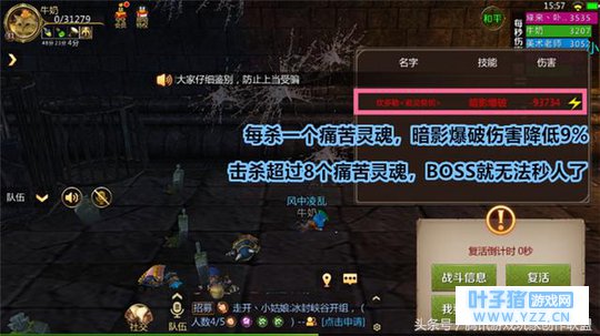 这2个技能是BOSS的组合技,会同时释放,为什么我们推荐优先组守护者做T,优先选择咒术师做DPS呢?就是因为这2个职业会聚怪技能(将怪集中到一起),当这2个职业将痛苦灵魂聚集起来之后,大家使用群攻技能,就能快速消灭痛苦灵魂了。这个BOSS团灭往往是因为没有打死足够的痛苦灵魂,其实只要队伍中有守护者或者咒术师,就能轻松消灭10个痛苦灵魂。