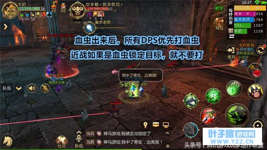 寄生血虫:玩家获得6秒伤害DOT,结束时召出2条血虫,血虫随机锁定一名目标,接触到目标后钻入目标体内,继续使该目标感染血虫DOT,如此重复。 寄生血虫是BOSS最经常使用的技能,应对方法也非常简单,那就是当血虫孵化后,所有DPS先杀血虫,坚决不能让血虫碰到锁定的人!不过在此要注意的是,近战职业先看一下自己是否是血虫锁定的目标,如果是的话,那就别去攻击血虫了,让别人帮你打就行。
