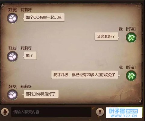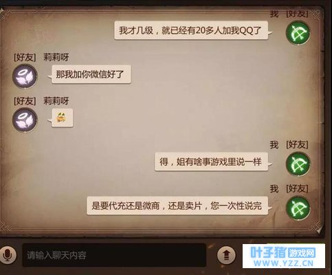 各种加好友,各种求组队,好友信息多到让人有种桃花来了的错觉!突然想,放弃做游戏任务,只想静静的在游戏中聊骚天! 然而,每个加我好友的人,和我没聊两句就说要加我QQ,这种套路再熟悉不过了!不是微信就是代充,要么就是卖小黄片的!他们总有一千种要我QQ的方式,而我就是不给!(ps:网络世界以保护自己的隐私为主!)