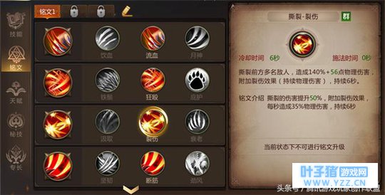 撕裂-裂伤:撕裂技能使用了裂伤铭文后,可以对目标附加裂伤效果,效果为对目标每秒造成35%物理伤害,效果持续6秒。撕裂技能的冷却时间也只有6秒,只要我们合理释放技能,就可以让敌人身上一直保有裂伤状态。