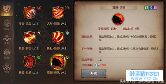 震撼-惊吼:践踏周围敌人,造成伤害并恐惧2秒。还是群体控制技能!守护者拉人后,可以继续群控,在被包围后,也可以用此技能解围。