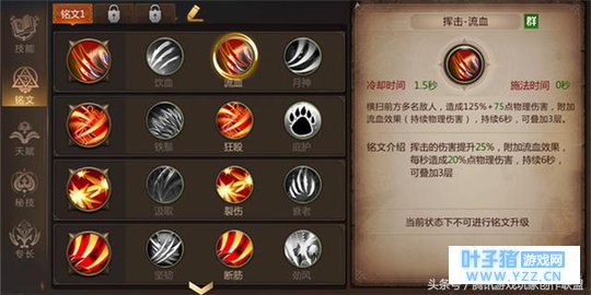 野性系守护者拥有极为强大的持续伤害能力,可以为敌人附加流血与裂伤效果,这样一来,即使敌人远离守护者也会受到流血和裂伤效果的伤害! 挥击-流血:使用流血铭文的挥击技能只要击中了敌人,就可以让敌人流血,这个流血效果持续6秒,可以叠加3层,每一层流血效果每一秒都可以对目标造成20%物理攻击伤害。挥击技能是熊熊的平砍技,冷却时间只有1.5秒。所以,熊熊要为目标叠加3层流血效果是非常简单的。