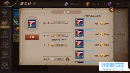 例如,我们要出售1级免伤彩色宝石,上架初始价格为9500金币,可以通过+或-来控制想要出售的价格,可以升幅50%或降幅50%。