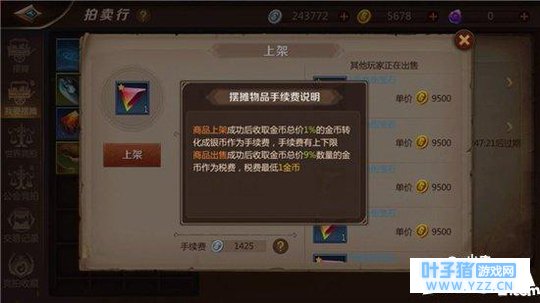 上架时需缴纳上架的手续费,为售价的1%,以9500金币为例,那就要收取95银币。