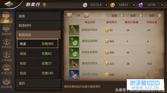 而炼金则不同,炼金可以制作攻击药剂、防御药剂、生命药剂、恢复药剂。 游戏中的开荒需要消耗这四类药剂,每周的公会副本、战场、竞技场、精英副本,这些活动也都需要这些药剂,作为一种消耗道具,药剂能够有效降低许多玩法的难度,尤其是在冒险者等级差距逐渐变小,副本难度逐渐提高的这种情况下,药剂的市场会变得越来越大,生产者的收入空间也会随之变大,这是其他三个以制造装备为主的生活技能所不具有的优势。