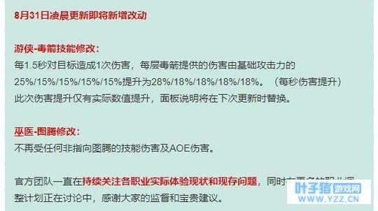 当然了,除了小德,还有几个职业也是“全游戏最弱势职业”的候选人,这其中,当属猎人玩家的呼声最为强烈。 在8月30日的更新里,猎人这个职业得到了加强。而在第二天的又一次更新里,猎人职业再次改动,毒箭技能伤害增加。这连续两拨的改动可以说很大程度上提升了猎人玩家们的游戏体验。然而,这还是不能从根本上的改变现阶段猎人职业的弱势,不仅PVP打不过同等战力其他职业的玩家,PVE下副本也没人组,实在是尴尬的很。