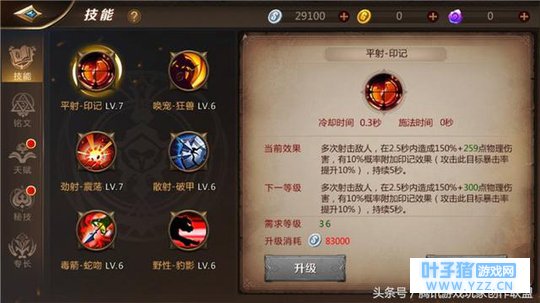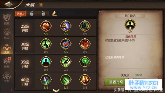 狂暴打击:如果目标身上有毒箭效果,那么游侠对其所有的伤害将会提升。游侠与敌人交战的时候起手毒箭技能,能提升接下来的伤害输出。 鹰眼压制:当目标生命值越低时,触发暴击的概率就越大。这能够很好的提升游侠的收割能力,是个通用的天赋加点。 弱点洞察:该天赋加点主要是为了配合技能平射-印记,让游侠的平射伤害更加简单粗暴。 荷枪实弹:使用技能会概率触发额外伤害,比较朴实无华的输出天赋,PVP战斗中效果也不错。