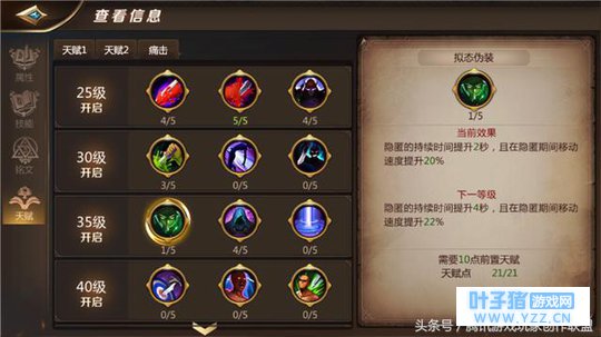 拟态伪装:隐匿的持续时间提高2秒,移动速度提升20%。这个天赋至少要加1点,很多打PVP的刺客也只加1点,因为加1点拟态伪装天赋就可以提高隐匿时20%的移动速度,继续加点,每加1点只提高2%的移动速度。