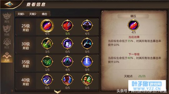 碾压:当目标生命值低于一定百分比时,对其暴击率提高10%,这是绝大部分刺客都会选择的天赋,不管是PVE还是PVP都会选择他,不过区别是有的刺客朋友只加3-4点,并不加满,有的朋友则是加满5点。